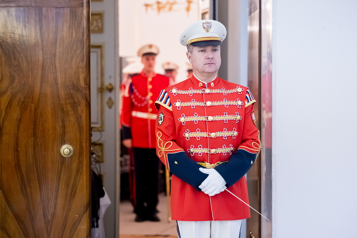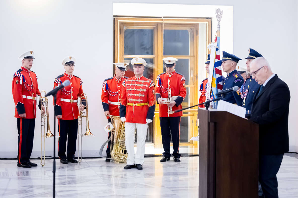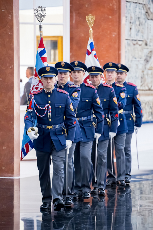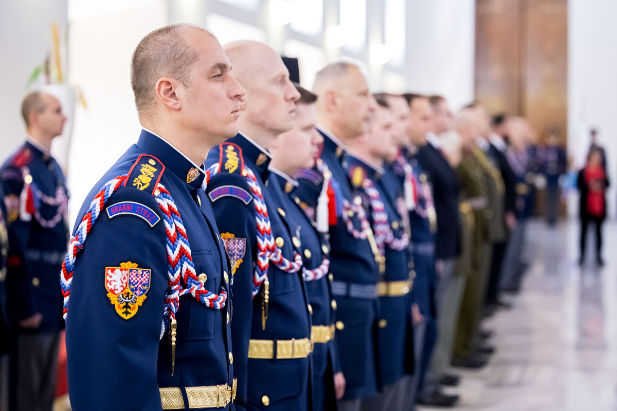 Poté jsme se přesunuli do Rothmayerova sálu, kde proběhlo slavnostní ocenění příslušníků Hradní stráže a osob, které s Hradní stráží blízce spolupracují. Mezi námi jsme přivítali vzácnou návštěvu - prezidenta republiky Petra Pavla, který poděkoval vojákům za jejich službu a popřál jim mnoho sil do dalších let.