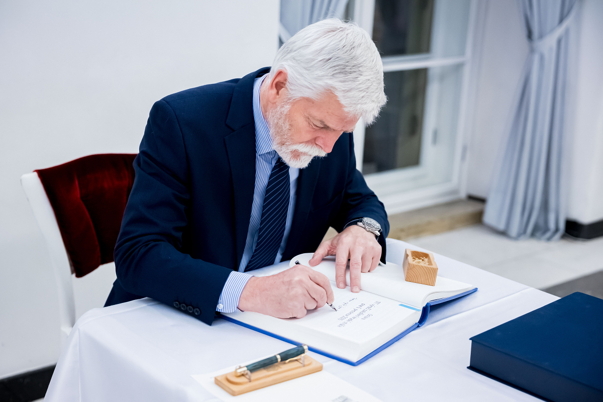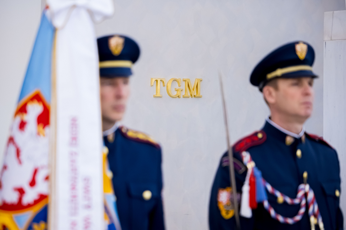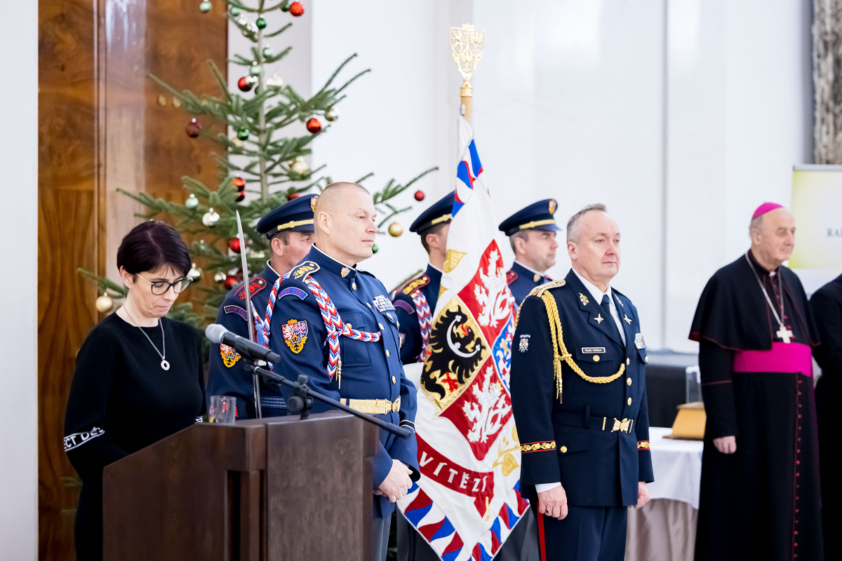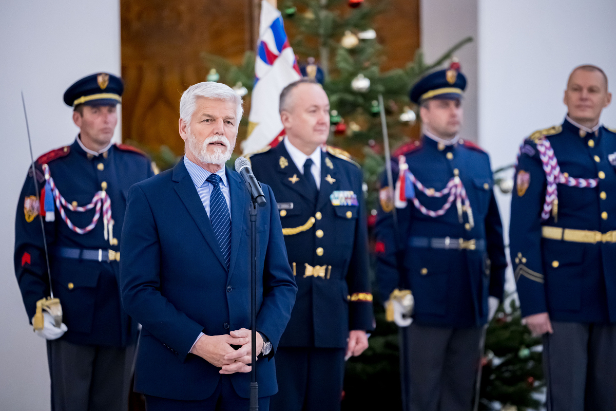 Poté jsme se přesunuli do Rothmayerova sálu, kde proběhlo slavnostní ocenění příslušníků Hradní stráže a osob, které s Hradní stráží blízce spolupracují. Mezi námi jsme přivítali vzácnou návštěvu - prezidenta republiky Petra Pavla, který poděkoval vojákům za jejich službu a popřál jim mnoho sil do dalších let.